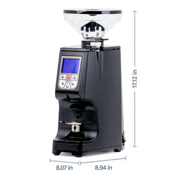 The Eureka Atom 65 is an espresso focused all-purpose home espresso grinder with 65mm flat steel burrs. This grinder uses a digital timed dosing system and stepless adjustment, a hands-free portafilter holder, and a grounds bin.