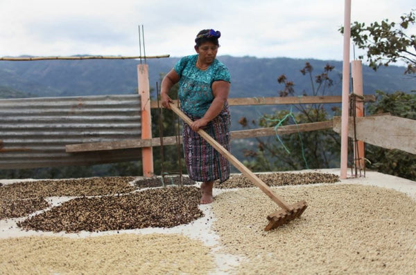 Angela Camposeco, a Popti Mayan coffee grower and CODECH member, rakes coffee beans at home to speed up sun-drying. Angela and her husband have been affiliated with CODECH for years and have eight children. c/o Fair Trade USA®️