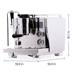 The Rocket R Nine One is a dual boiler espresso machine with a saturated group head, PID temperature control, shot timer, and a rotary pump that can be direct plumbed or run on its internal reservoir. It features manual and programmable pressure profiling, allowing you to save up to 5 coffee recipes via the control knob or the color touchscreen.