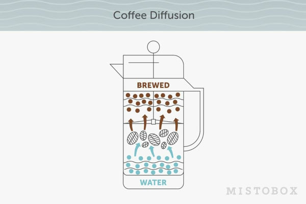 Diffusion occurs through osmosis when solubles move from areas of high concentration (the coffee grounds) to areas of lower concentration (the water). Once the coffee particles are saturated with water, the osmosis process draws the coffee chemicals out of the grounds and into your brewed coffee. After wetting, your coffee grounds are more concentrated inside than outside, so by osmosis, the water that was absorbed into the grounds leaves, pulling desirable flavors out of the coffee bean and into the brewed liquid.