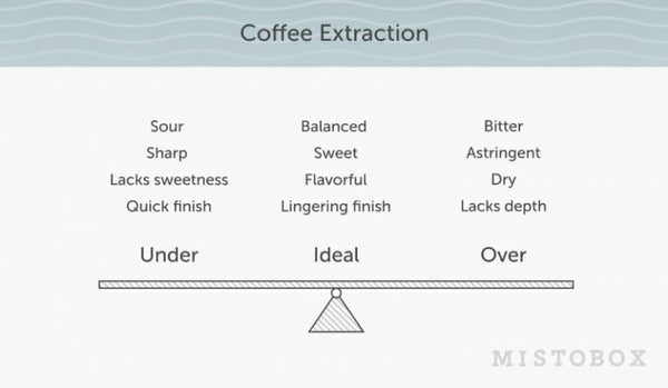 During the brewing process, different flavors are extracted at different times. Generally speaking, acidic and fruity flavors are extracted first, followed by sweet and bitter flavors. The goal with brewing is to pull as many desirable flavors (acids, fats, sugars, and fruity flavors) from the coffee grounds as possible without taking it too far and pulling out undesirable coffee flavors that dominate the pleasant ones (bitterness and astringency). Think of extraction as a scale we try to balance to get the right flavors and taste of coffee.