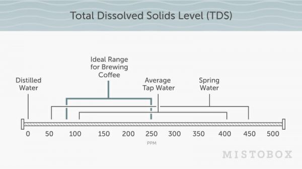 If you are going to use tap water we recommend using a gravity-based carbon filter (like a Brita, PUR, or Soma) to remove chlorine. Chlorine is added to most municipal water to make it safe to consume, but it can also bind with phenols from the coffee to produce chlorophenol. This awful-tasting chemical will undoubtedly detract from delicious coffee flavors. Using something like a Brita filter will ensure the water you use for coffee is safe, and chlorophenols won’t affect the taste. Unfortunately, carbon filters, like the Brita, do little else to remove dissolved chemicals and minerals from water, so the TDS and hardness of tap water can still fall above the ideal range, potentially producing other off-flavors or causing limescale to build up on brewing equipment.