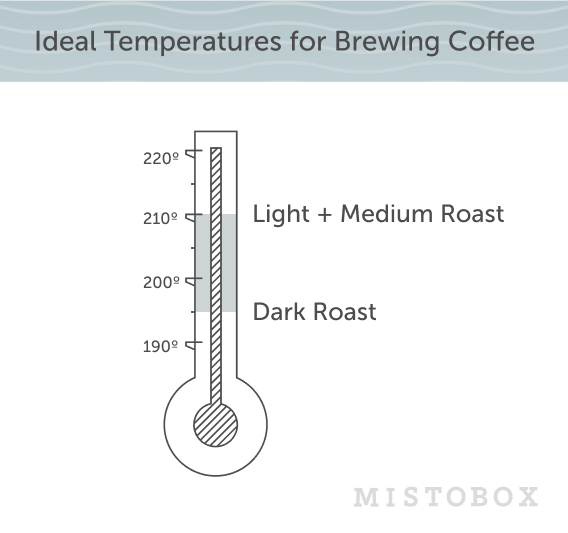 To get the slurry temperature ideal for the entirety of the brewing process and to compensate for heat loss, we recommend beginning brewing with a higher water temperature. We think it’s best to use a starting water temperature of 208ºF – 212ºF (98º-100ºC) for light to medium roasted coffees, effectively just below boiling. This is effective because these coffees tend to be more dense, and extracting the desirable flavor compounds is more challenging. Coffees that have reached a higher degree of development during the roast process (medium-dark to dark roasted coffees) more readily release soluble material during extraction and, therefore, don’t require as much heat to extract. In our experience, we have found that lower starting temperatures, like 195ºF – 200ºF (90º-93ºC), work just fine for dark roasts and prevent over-extracting some of the more bitter and harsh flavors.